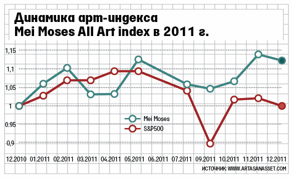 В 2011 г. вложения в искусство оказались доходнее, чем американский рынок акций. Основной барометр арт-рынка – индекс Mei Moses All Art index за год вырос на 11%, а индекс S&P 500 прибавил всего 2%За последние 10 лет Mei Moses All Art index, который отслеживает цены повторных аукционных продаж предметов искусства, шесть раз обгонял знаменитый индикатор широкого рынка акций США, а его среднегодовая доходность составила 7,8 против 2,7% у индекса S&P 500.