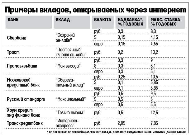 Банки, как никогда, щедры к клиентам, предлагая им различные способы вложить деньги под более высокий, чем обычно, процент. Один из них – оформить вклад через интернетС прошлого года многие банки стали не только повышать ставки по вкладам, но и дополнительно поощрять клиентов, открывающих депозиты вне офиса. Сбербанк, Промсвязьбанк, Транскредитбанк, «Русский стандарт», банк «Траст», Московский кредитный банк (МКБ) и другие дали вкладчикам возможность открывать онлайн-депозиты с повышенными процентами через интернет-представительство банка. Премия для онлайн-вкладчиков может составить 0,1–0,5 процентного пункта независимо от суммы и срока вклада.
