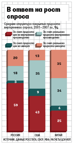 Доля покрытия роста внутреннего спроса инфляцией сократилась с 70% в начале 2000-х гг. до примерно 50% в 2007–2008 гг.; в 2011 г., по предварительной оценке, она составила 55%. Стимулирование спроса выливается прежде всего в рост цен, увеличение импорта и лишь в малой степени компенсируется ростом выпуска.