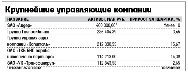 В пятерку крупнейших управляющих вошла «ТКБ БНП париба инвестмент партнерс». «Рост обусловлен ростом рынка акций (9,7 млрд руб.), а также интересом со стороны иностранных инвесторов – рост активов международных клиентов составил 21% (12,24 млрд руб.)», – говорит гендиректор «ТКБ БНП париба инвестмент партнерс» Владимир Кириллов. Еще около полумиллиарда рублей компании должна была обеспечить передача трех ПИФов от «Пионер инвестмент менеджмент», покинувшей Россию.
