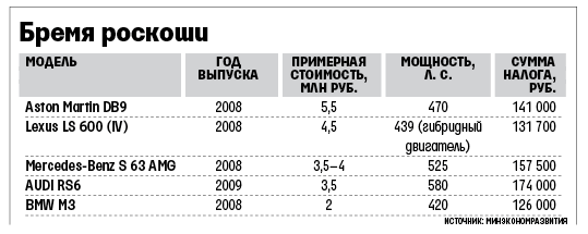 Мощность в 410 л. с. – высокий порог, замечает гендиректор auto-dealer.ru Олег Дацкив: это действительно роскошь, таких машин на рынке около 2%. Мощнее 410 л. с. также автомобили спортивных марок Aston Martin DB9, Porsche 911 GT3, Audi RS и R8, BMW M, Mercedes-Benz AMG. Минфин обещает не брать налог на роскошь со спортивных машин и мотоциклов, которые используются только для соревнований.
