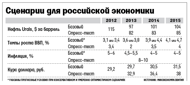 Дорогая нефть не слишком ускорит экономику: если баррель Urals в 2012–2013 гг. будет стоить $125, а в 2014–2015 гг. подешевеет до $115–120, темпы роста ВВП превысят базовые на 0,3–0,4 п. п., а к 2015 г. сравняются с ними, несмотря на разницу в цене нефти в $16. Дорожающая нефть больше не привлекает иностранных инвесторов, констатирует Минэкономразвития, к тому же дорогая нефть укрепит рубль (до 27,5 руб./$ в 2012–2013 гг.), а это ускорит рост импорта и притормозит развитие экономики.