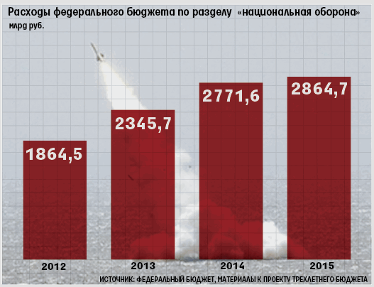 О деталях выработанной схемы рассказали Силуанов и вице-премьер Дмитрий Рогозин (их цитаты по «Интерфаксу»). Сами закупки по госпрограмме вооружений (20 трлн руб. до 2020 г.) не будут переноситься на более поздний срок, заявил Рогозин. Чтобы сокращение расходов бюджета не привело к сокращению гособоронзаказа, министерства финансов и обороны, по его словам, дорабатывают механизм кредитования предприятий ОПК «четверкой» госбанков (ВЭБ, ВТБ, Сбербанк, Газпромбанк) на сумму в 200–400 млрд руб. по ставкам не более 10% и под гарантии бюджета. Для этого могут быть пересмотрены объемы средств на госгарантии, заложенные в бюджете, сказал Силуанов (действующий план на 2013–2015 гг. – 560,7 млрд руб. и $13,9 млрд).