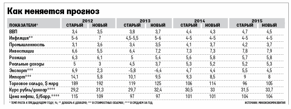 Минэкономразвития скорректировало макропрогноз на 2012–2015 гг. Экономика будет расти медленнее, чем ожидалось еще весной, рубль ослабнет сильнее, рост промышленности притормозит, как и рост потребления. Прогноз слишком оптимистичный, считают эксперты