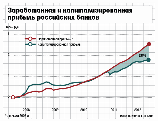 Угроза кризиса миновала российские банки, считают их владельцы. Если в 2008–2010 гг. собственники вливали в капитал больше, чем зарабатывали банки, то сейчас изымают почти треть прибыли. Хотя уровень достаточности капитала минимален с конца 90-х гг.Основным источником пополнения капитала в банковской системе сейчас является прибыль. И если в 2009–2010 гг. капитал российских банков рос за счет дополнительных вложений собственников, то в 2011–2012 гг. почти треть заработанной банками прибыли владельцы изъяли в виде дивидендов (см.врез). Об этом говорится в презентации предправления «Юникредит банка» Михаила Алексеева для недавнего совещания у премьера Дмитрия Медведева.