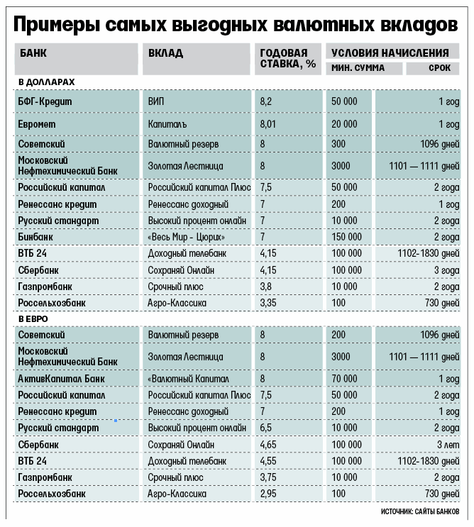 В этом году уровень ставок по валютным вкладам крупнейших банков снизился в среднем на 0,3 процентного пункта. Тем не менее в некоторых банках, преимущественно второй-третьей сотни по активам, условия размещения валютных средств до сих пор остаются весьма выгодными: несколько тысяч долларов или евро можно разместить на 1–2 года под 8% годовых. А в Росинтербанке еще на прошлой неделе можно было разместить $150 на срок не менее двух лет под 9% годовых, а 150 евро – под 8,5%, но сейчас только под 7,5 и 7% соответственно. В банках первой сотни, таких как «Русский стандарт», «Российский капитал», «Ренессанс кредит», ставки сейчас также доходят до 7% годовых (см. таблицу).