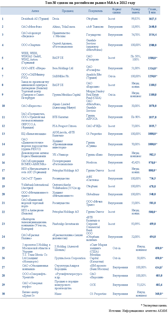 Крупнейшей сделкой стала покупка Сбербанком турецкого Denizbank за $3,8 млрд, второй – выкуп у Altimo акций «Мегафона» компаниями Megafon Investments и «АФ телеком» Алишера Усманова за $2,64 млрд, третьей - переход контрольного пакета акций аэропорта Внуково от правительства Москвы в федеральную собственность за $1,53 млрд. Покупка «Роснефтью» компании ТНК-BP за $55 млрд в список не вошла, поскольку закрывается в 2013 г.