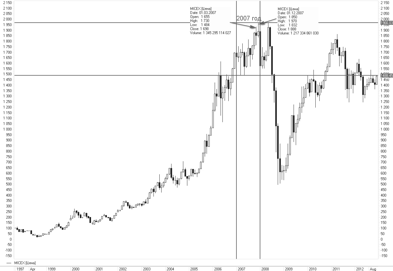 Можно ли хотя бы в какой-то степени спроецировать ситуацию конца 2007 г. на текущий момент? Ответ однозначный: нет. В 2007 г. был показан исторический максимум индекса ММВБ. Этому предшествовали девять лет восходящего тренда, причем в 2005-2006 гг. наблюдался очень сильный рост.