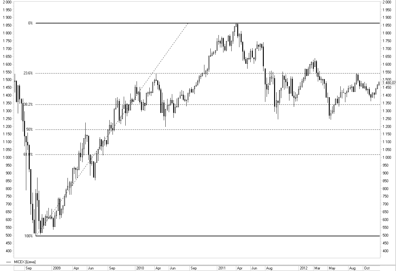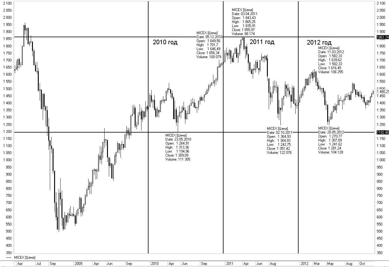 При этом нельзя не обратить внимание, что после «стагнации» 2007 г. рынок перешел в фазу очень сильных движений: сначала обвал 2008 г. (индекс снизился в 4 раза), потом впечатляющий рост 2009 г. с повышением от минимума к максимуму в 2,7 раза.