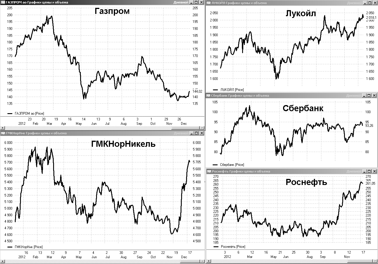 В-третьих, именно в этом году наиболее отчетливо выявилась тенденция разнонаправленности ценовых движений основных российских акций. Их годовые тренды служат наглядной иллюстрацией к известной басне И.А. Крылова. Так, Сбербанк и «Лукойл» показали повышение, оставаясь при этом в очень узком ценовом диапазоне года. «Газпром» продемонстрировал выраженное падение, «Роснефть», наоборот, выросла, преодолев максимумы прошлых лет, а ГМК «Норильский никель» вообще сумел проделать движения в трех направлениях: сначала многомесячный боковик, потом в ноябре выход вниз, с пробоем минимума предыдущего года, а в декабре разворот наверх с ростом к годовым максимумам.