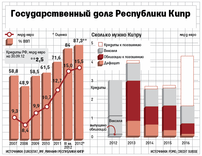 По оценкам Credit Suisse, до 2016 г. Кипру потребуется до 10 млрд евро (56% ВВП) на рекапитализацию банков и еще 6,5 млрд при условии, что Россия согласится реструктурировать кредит. До июня Кипр сможет сам обслуживать долг, указывают аналитики Credit Suisse, потом может наступить дефолт, так как Кипру предстоит выплатить 1,4 млрд евро по облигациям. Предоставление помощи может быть отложено до марта из-за разногласий между кредиторами, пишет FT.