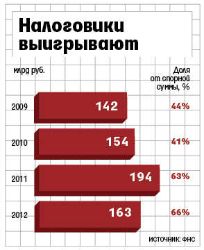 Налоговики отсудили у компаний 163 млрд руб. – это 66% спорных сумм (год назад – 194 млрд руб., или 63%). Еще по итогам 2010 г. результат был в пользу налогоплательщиков – они успешно обжаловали 59% требований чиновников на 218 млрд руб.