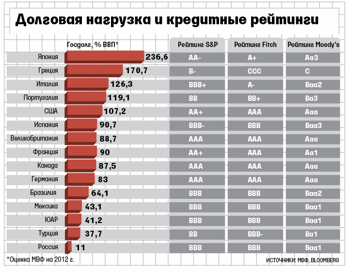 Занижен и кредитный рейтинг России, указывает Минфин в «Основных направлениях долговой политики» на 2013–2015 гг. Экономические показатели лучше, чем у многих стран с рейтингом ВВВ и даже с рейтингом А (см.инфографику).