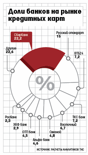 Большую часть прироста (63%) обеспечили пять лидеров рынка (см. график), из них 28,4% – Сбербанк. Он возглавляет список и по объему портфеля – 149,3 млрд руб., и по темпам роста: за год он удвоил портфель. Это позволило ему оторваться от прежнего лидера – «Русского стандарта», который в начале года имел рыночную долю, практически равную Сбербанку: 16,1% против 17,1% у госбанка. К концу года разрыв между ними увеличился: доля «Русского стандарта» сократилась до 15%. При этом портфель кредитных карт «Русского стандарта» продолжает расти: за год – с 59 млрд до 100,9 млрд руб. (+71%).