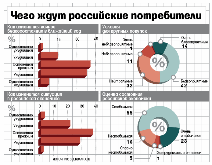 Несмотря на неуверенность в долгосрочной устойчивости российской экономики (см.инфографику), российские потребители достаточно оптимистично смотрят в собственное будущее. В течение двух лет 42% рассчитывают приобрести новый автомобиль, около 50% намерены купить дом или квартиру в среднесрочной перспективе.