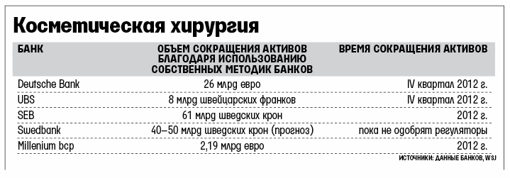 Банки всеми силами наращивают капитал – чтобы быть готовыми к вступлению в силу нормативов «Базель III». В ход идут в том числе и косметические меры. Deutsche Bank недавно пересчитал по собственной методике объем активов, взвешенных с учетом риска, по состоянию на IV квартал 2012 г. В итоге объем активов сократился на 26 млрд евро ($34,8 млрд). В результате аналогичных действий UBS понизил оценку активов на 8 млрд швейцарских франков ($8,7 млрд), SEB – на 61 млрд шведских крон ($9,5 млрд), Portuguese Commercial Bank – на 2,19 млрд евро. Swedbank ожидает решения регуляторов, которые должны одобрить его методику оценки стоимости активов. В случае положительного решения он сможет сократить активы на 40–50 млрд крон ($6,2–7,8 млрд).
