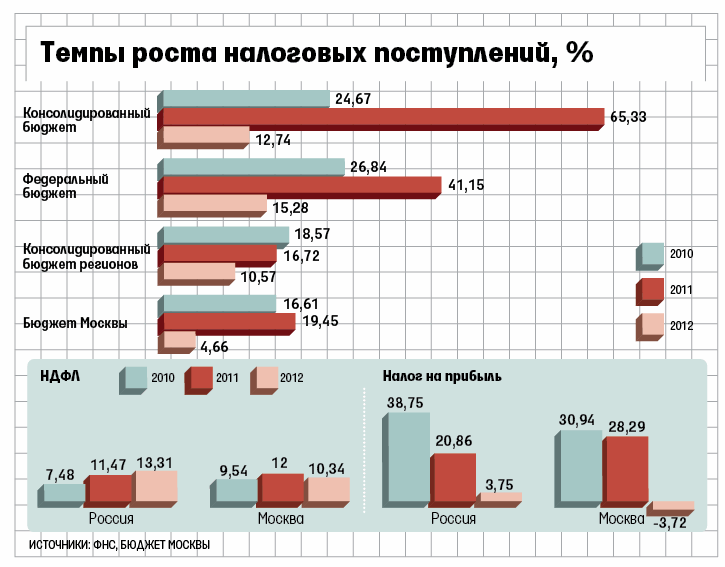 Еще одна причина – военная. По словам Третьяковой, ранее Минобороны платило НДФЛ централизованно в бюджет Москвы, а с 2012 г. – в регионы, где военные служат. В итоге поступления НДФЛ в бюджет Москвы выросли на 10,3% при общероссийских темпах около 13%. Сколько из-за изменения порядка уплаты налога Минобороны недополучила столица, Третьякова затруднилась сказать.