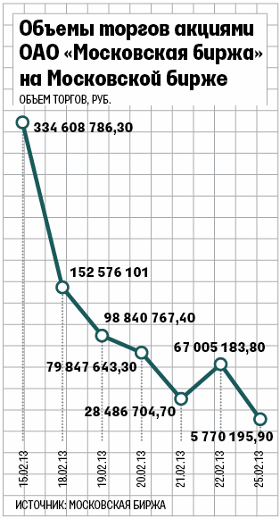Вчера на основном рынке Московской биржи объем торгов ее акциями составил 5,7 млн руб. В первый день торгов, 15 февраля, с этими бумагами было заключено сделок на два порядка больше: оборот составил 335 млн руб. Но с тех пор он почти непрерывно снижался (см. график). В результате объем торгов бумагой, поначалу сопоставимой по ликвидности с акциями МТС или «Русгидро», упал примерно в 58 раз и стал сравним с объемом сделок с бумагами третьего эшелона. Такой объем – это «вообще ни о чем, его легко могут создать два «физика» с двух счетов», говорит трейдер крупной брокерской компании.