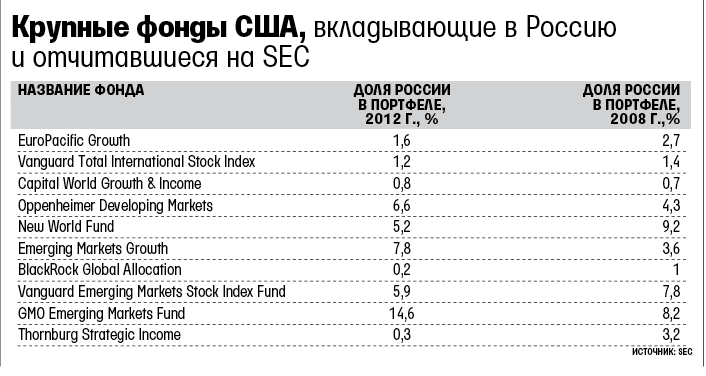 «Ведомости» изучили отчетность 10 крупнейших американских фондов, инвестирующих в Россию, с активами под управлением около $400 млрд. По итогам 2012 г. лишь четыре из них увеличили вложения в российские активы по сравнению с 2008 г., следует из данных SEC (см. таблицу).