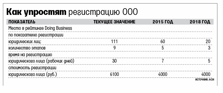 Уставный капитал ООО разрешат оплачивать в течение двух месяцев с момента регистрации (сейчас нужно сразу оплатить не менее половины), появятся типовые уставы, наличие печати перестанет быть обязательным условием регистрации. До конца 2014 г. Минэкономразвития подготовит законопроект, вводящий институт «регистрирующих агентов». Планируется наделить аккредитованные банки правом принимать документы на открытие предприятия одновременно с открытием счета, т. е. у предпринимателя отпадет необходимость лично посещать регистрирующий орган, объясняет директор АСИ по приоритетным проектам Александр Пироженко.