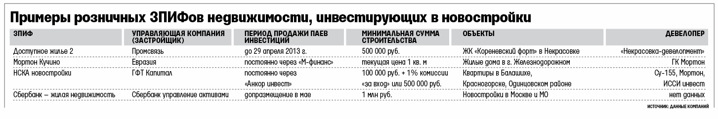 «Сбербанк управление активами» создал фонд «Жилая недвижимость» не под конкретный объект, а под саму идею инвестиций в строящееся жилье, – говорит Новиков, – УК планирует наполнять фонд квартирами в разных объектах разных застройщиков. Фонд будет вкладывать в наиболее востребованные объекты, где возможна ипотека. Это жилье в Москве и Подмосковье ценой 3–5 млн руб. за квартиру от девелоперов с положительной кредитной историей в Сбербанке». Размещение паев завершается, но в мае планируется допразмещение.