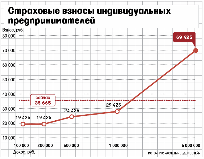 В конце марта Путин поручил правительству в течение двух недель проработать возможность снижения взносов либо предложить иное решение проблемы. Но прийти к единой позиции правительству не удалось. Вчера президент поставил точку в спорах, назвав вариант решения проблемы, который «считает основным». Предприниматели, зарабатывающие до 300 000 руб. в год, должны платить один МРОТ (платеж составит в этом году 19 425 руб.), свыше этой планки – МРОТ плюс 1% от своего дохода (см. инфографику). «Попрошу коллег в правительстве ускорить это решение на основе той формулы, которую я только что изложил», – заключил он.