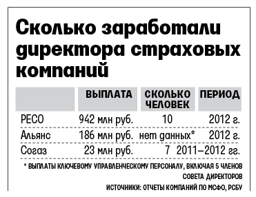 Президент «РЕСО-гарантии» Сергей Саркисов передал «Ведомостям» через представителя, что выплаты адресованы членам совета директоров. Рост вознаграждений, по его словам, вызван «улучшением финансовых показателей» компании «за отчетный период». Чистая прибыль страховщика выросла в 2012 г. до 5 млрд руб. по сравнению с 3,5 млрд руб. годом ранее.