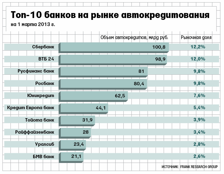 В 2012 г. рынок автокредитования вырос на 20% до 815 млрд руб. (оценка Frank Research Group).