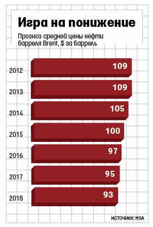 Прогноз мирового спроса на нефть на этот год МЭА повысило на 65 000 баррелей в день – до 90,6 млн. Есть опасность перепроизводства нефти, которое в итоге заставит цены упасть, считает Анита Сэн из Energy Aspects. По прогнозу МЭА, средняя цена барреля нефти снизится со $109 в 2013 г. до $93 в 2018 г. Вчера стоимость Brent упала на 0,29% до $102,5. В российском бюджете на этот год заложена цена в $105.