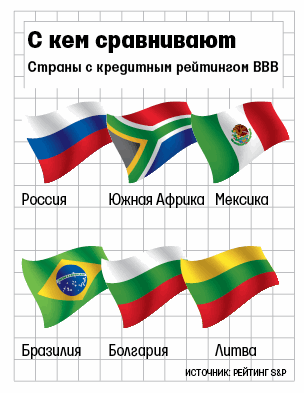 Инвесторы и сами оценивают страны. Например, Бразилия имеет схожий с Россией уровень рейтинга (а по шкале Moody's даже ниже), а ставка по ее госдолгу на 0,25 п. п. ниже, рассказывает аналитик Райффайзенбанка Денис Порывай. «У них экономика диверсифицирована», – объяснял Сторчак. Россия неблагоприятно смотрится на фоне стран с сопоставимыми рейтингами с точки зрения качества и эффективности госуправления, соблюдения принципа верховенства закона, уровня коррупции, говорится в отчете Fitch. Даже первый вице-премьер Игорь Шувалов, обсудив с агентствами рейтинги ряда госкомпаний, сделал вывод, что пока причин для пересмотра рейтинга нет, в том числе суверенного.