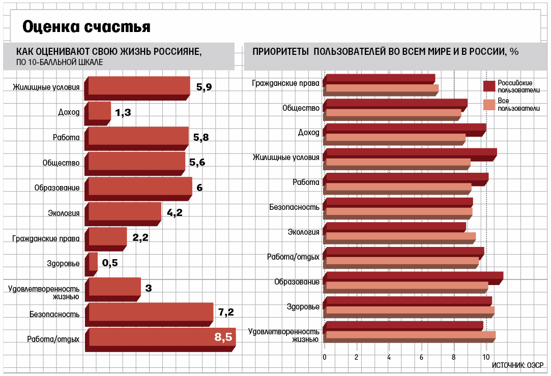Счастье исследователи определяют как рефлексивную оценку людьми обстоятельств, которые важны для ощущения благополучия. Оно измеряется также через испытанные положительные чувства и отсутствие негативных переживаний. В странах ОЭСР 80% опрошенных больше радуются, чем печалятся, в России – 74%. По показателю удовлетворенности жизнью Россия набрала лишь 3 балла (год назад было 5,3) и заняла 31-е место. Место не изменилось, отмечает Вахштайн. Больше других удовлетворены жители Швейцарии (10 баллов).