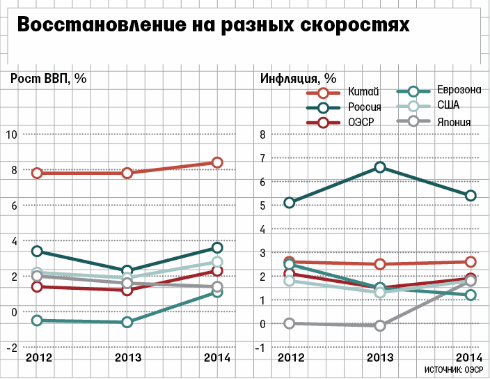 Страны с разной скоростью выходят из кризиса, отметил генеральный секретарь ОЭСР Анхель Гурриа: «У каждой экономики – уникальная траектория и свой комплекс рисков». Восстановление в странах ОЭСР в этом году будет слабым – рост на 1,2% и ускорение до 2,3% в 2014 г. В еврозоне в этом году ожидается более глубокий спад в 0,6% (прежний прогноз – 0,1%) против прогноза Еврокомиссии в 0,4% и ЕЦБ в 0,5%. Для Китая прогноз роста ВВП понижен с 8,5 до 7,8%. Вчера ухудшил свой прогноз для этой страны и МВФ – с 8% в 2013 г. и 8,2% в 2014 г. до 7,75%.