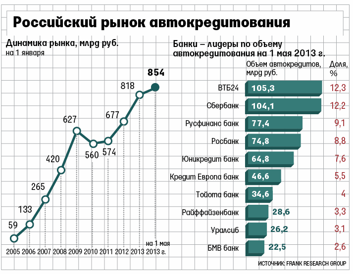 На 1 мая крупнейший портфель автокредитов был у «ВТБ 24», вытекает из исследования компании Frank Research Group. С начала года он вырос на 10,3% до 105,3 млрд руб., а у Сбербанка – всего на 1,5% до 104,1 млрд. Весь рынок автокредитования прибавил 4,5% до 854 млрд руб.