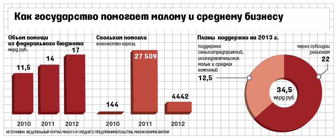 Представитель первого вице-премьера Игоря Шувалова (курирует в правительстве малый бизнес) не смог сказать, поддержит ли его начальник предложения Минфина. В 2013 г. федеральный бюджет потратит на поддержку малого и среднего бизнеса 34,5 млрд руб. Почти 22 млрд из них – субсидии, которые Минэкономразвития распределяет по регионам на местные программы поддержки. Остальное – поддержка сельхозпредприятий и финансирование прикладных научных исследований и разработок малых предприятий (см. график).