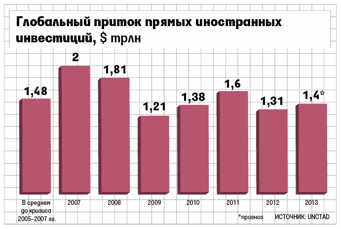 Мировые инвестиции переживают не лучшие времена. По итогам прошлого года глобальный приток прямых иностранных инвестиций снова сократился после трех лет посткризисного восстановления, за которые он тем не менее не смог приблизиться к пику 2008 г. В 2013 г., по прогнозу Конференции ООН по торговле и развитию (UNCTAD), приток может возобновить скромный рост – если глобальная экономика, как ожидается, все-таки продемонстрирует улучшение, уточняют авторы прогноза.
