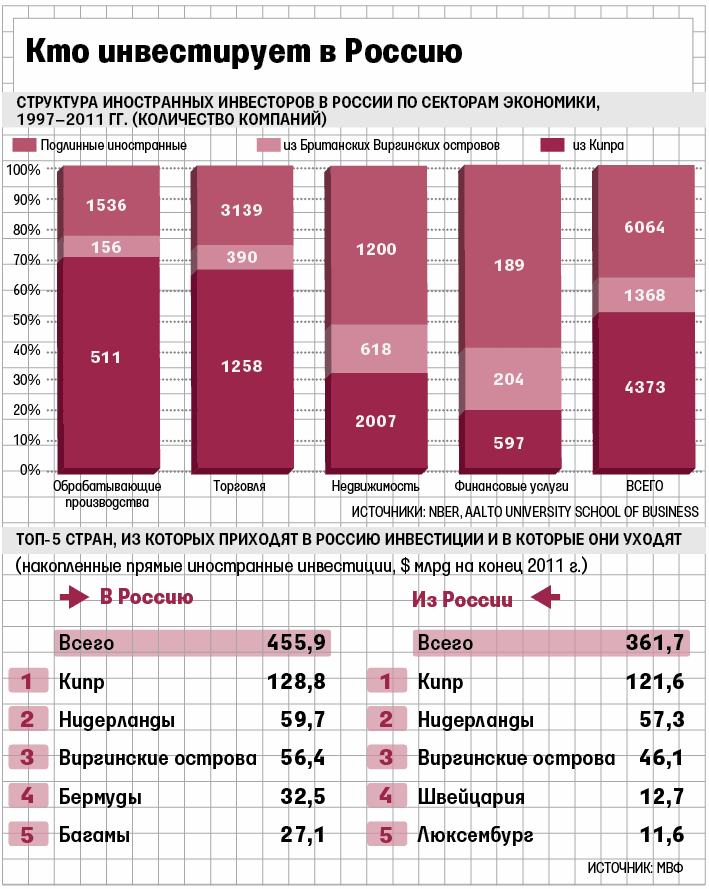 По данным МВФ на конец 2011 г., почти половина (47%) накопленных за рубежом прямых инвестиций из России приходится на Кипр и Британские Виргинские острова (БВО). А источником 54% прямых иностранных инвестиций в Россию стали четыре юрисдикции: кроме Кипра и БВО это Бермудские и Багамские острова.