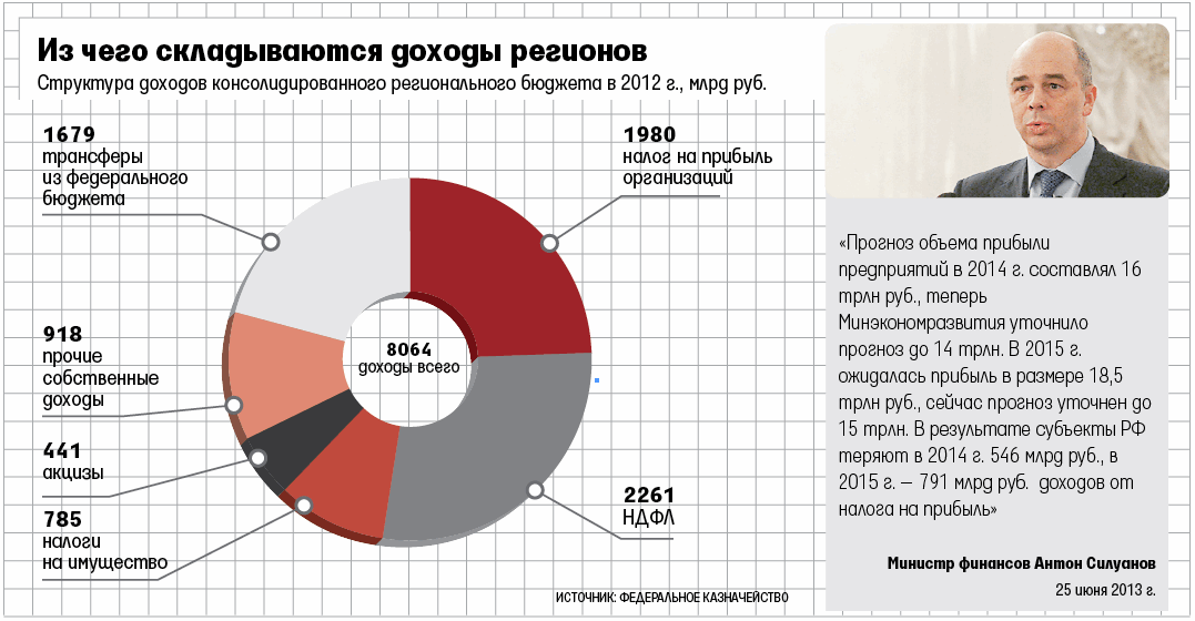 В Минфине вчера не смогли вспомнить прежнего прогноза поступлений от налога на прибыль, но в любом случае этот налог – один из основных источников доходов для регионов. По данным Федерального казначейства, поступления от него составляют треть всех собственных доходов регионов, а вместе с НДФЛ – половину доходов. Даже номинальная стабилизация поступлений от налога на прибыль – стресс для регионов, указывает Вартапетов. Скрашивают картину поступления от НДФЛ, продолжает он: «Этот налог более стабилен и будет расти в среднем на 10%, в том числе благодаря росту зарплат бюджетников».