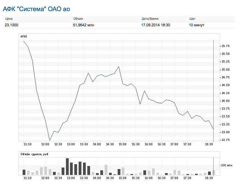 На Московской бирже существенный рост объемов торгов по АФК "Система" пришелся на 11:40, когда акции прыгнули с 22,99 руб. до 23,5 руб. (2,2%). Резкий обвал котировок начался с 12:50 - за 10 минут акции «Системы» подешевели с 22,9 руб до 21,03 руб. (8,2%). Обвал сопровождался повышенным объемом торгов (102 млн за 10 минут). Инвесторы еще полчаса пытались активно торговать «Системой», немного приподняв ее акции (21,23 руб. к 14:00), после чего объемы сделок резко сократились.
