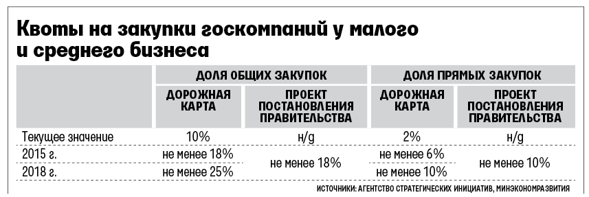 В более ранней версии проекта требования к госкомпаниям были жестче. К 2015 г. у малого и среднего бизнеса нужно было закупать 25% товаров и услуг, в 2014 г. - не менее 15%. Решено синхронизировать требования постановления с контрольными показателями дорожной карты (см. таблицу), поясняет представитель Минэкономразвития.