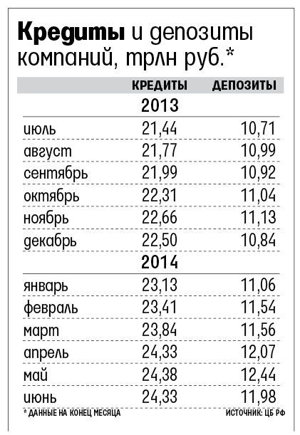 По данным ЦБ, компании забирают и средства с депозитов и счетов - объемы депозитов юрлиц за месяц сократились на 3,7%, а средства на расчетных счетах - на 0,4%. Например, сокращение средств юрлиц на счетах Сбербанка составило за июнь 270 млрд руб., в том числе из-за переоценки. Возможной причиной оттока депозитов юрлиц может быть необходимость погашения кредитной задолженности - в первую очередь привлеченной на зарубежных рынках - той, с рефинансированием которой в текущих условиях возможны затруднения, предполагает начальник аналитического управления банка «Нордеа» Дмитрий Феденков.