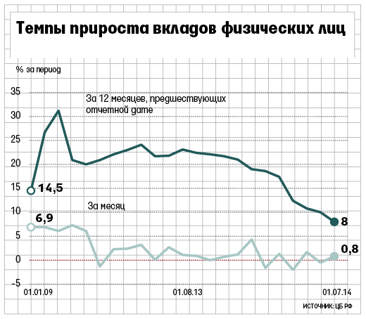 В целом по банковской системе с начала этого года депозиты физлиц сократились на 0,4% до 16,88 трлн руб. В январе - июне прошлого года этот показатель, напротив, вырос на 9,7%, а за весь 2013 год банки нарастили розничные депозиты на 19%.