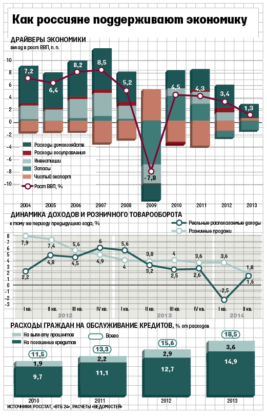 Кредитование больше не поддерживает рост потребления, а потребление вносит все меньший вклад в рост экономики. По расчетам HSBC, в 2013 г. потребкредитование обеспечило почти 1 п. п. роста частного потребления и 0,6 п. п. роста ВВП (из 1,3%), а в 2014 г. его вклад в экономику будет отрицательным - оно отнимет от роста ВВП 0,1 п. п. На торможение роста кредитования повлияло и начавшееся с марта повышение ставок, указывает Наталия Орлова из Альфа-банка. Если ЦБ не снизит ставки, то вклад кредитования в рост ВВП может обнулиться или стать отрицательным, так как население будет снижать кредитное плечо, считает Орлова: «Нет сомнений, что регионы присоединятся к московскому тренду».