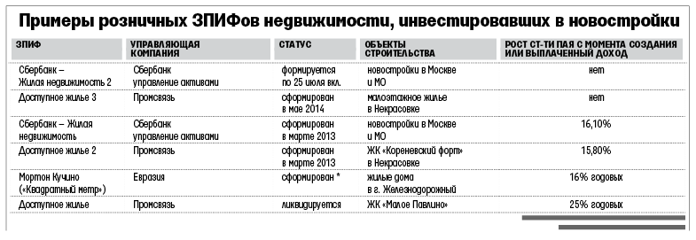 Одной из первых инвестиции в строящееся жилье через ЗПИФ розничным инвесторам предложила УК «Промсвязь». Для этого в декабре 2012 г. был создан ЗПИФ «Доступное жилье», в апреле - мае прошлого года - ЗПИФ «Доступное жилье 2», а в мае этого года - «Доступное жилье 3». Все фонды - с минимально возможным для ЗПИФа сроком в три года и входным билетом в 0,5 млн руб. Объекты инвестирования - квартиры в малоэтажных комплексах в 10 км от МКАД в Некрасовке, куда ведется новая линия метро.