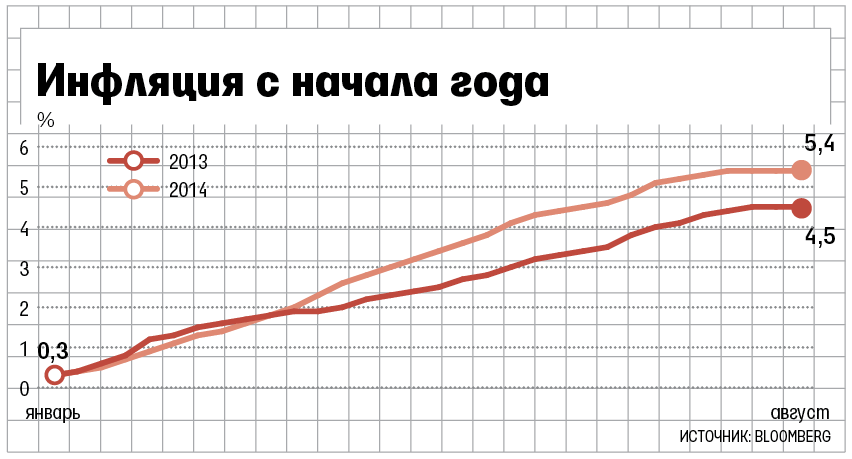 Санкции подстегнули инфляционные ожидания в принципе, уверена Наталия Орлова из Альфа-банка. Инфляционные риски выросли в связи с усилением геополитической напряженности, констатировал ЦБ в конце июля, объясняя решение повысить ключевую ставку с 7,5 до 8%. После снижения до 7,3% на прошлой неделе в годовом выражении инфляция вернулась к отметке 7,4%, отмечает Полевой: «Это неприятный момент: рынок ждал снижения темпов».
