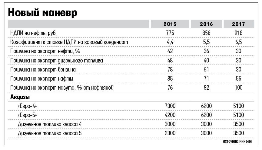 Большинство из ставок в проекте схожи с вариантом, согласованным с компаниями и Минэнерго в начале августа, однако в последний момент появились отличия - более резко увеличивается НДПИ в 2015 г. (до 775 руб., а не до 765 руб.), а в 2017 г. не так сильно снижаются акцизы на бензин и дизтопливо - ставки выше прежнего плана на 600-700 руб. Эти изменения увеличат доходы бюджета на 93 млрд руб. за три года по сравнению с предыдущей версией, оценивает руководитель Московского нефтегазового центра EY Денис Борисов.