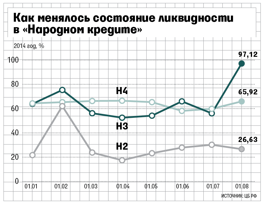 В июне - июле у банка текущая ликвидность близка к нормативному минимуму, констатирует руководитель аналитического управления НРА Карина Артемьева. На 1 июля норматив Н3 у банка был 56,1%. Банк предпринимал действия по привлечению межбанковских кредитов и получал их, говорит она, это помогло ему пережить нехватку ликвидности и продолжить исполнять обязательства перед клиентами. Ситуация в банке стабилизировалась, утверждает Артемьева. На 1 августа Н3 у банка - 97,12%. Правда, из отчетности следует, что в июле основной объем ликвидности банк привлек с помощью векселей - на 2,7 млрд руб.