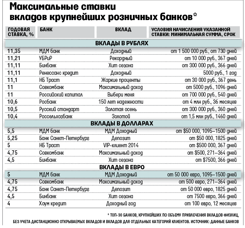Теперь лучшие ставки в рублях в некоторых крупных банках перевалили за 11% годовых (см. таблицу).