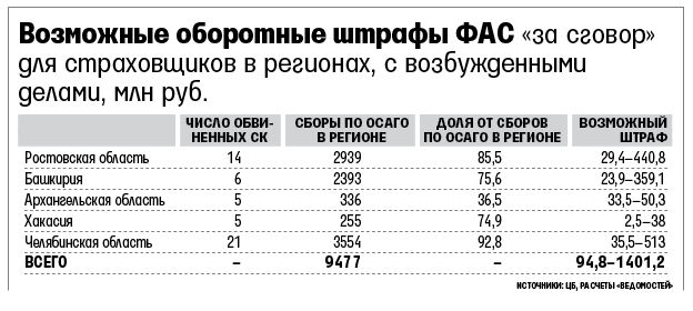 На 14 обвиненных в сговоре страховщиков пришлось 85,5% сборов по ОСАГО в 2013 г. в Ростовской области, подсчитали «Ведомости». А размер совокупно грозящего им штрафа колеблется в пределах 29-440 млн руб. (см. таблицу).