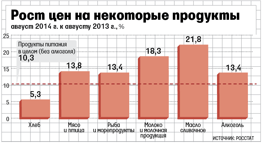 Одна из причин спада продовольственной розницы - высокая инфляция: в августе дефлятор отрасли составил 10,8% против 8,7% в среднем за первое полугодие и 7,6% в августе 2013 г. (все - к тем же периодам предыдущего года). Дефлятор непродовольственного ритейла в августе был почти вдвое ниже - 5,6%. Максимальными темпами дорожают продукты, подпавшие под российские санкции, а также алкоголь и табак - из-за повышения акцизов.