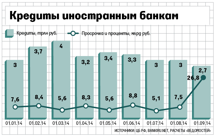 Иностранные банки задерживают кредиты, полученные в российских банках. Просроченная задолженность по ним с учетом процентов в августе выросла в 3,6 раза до 26,8 млрд руб., следует из данных ЦБ. Всего за месяц иностранные банки не выплатили в срок 99,4 млрд руб. кредитов и процентов по ним - в 7,2 раза больше, чем в июле (таковы дебетовые обороты по этим счетам), но большую часть средств вернули.